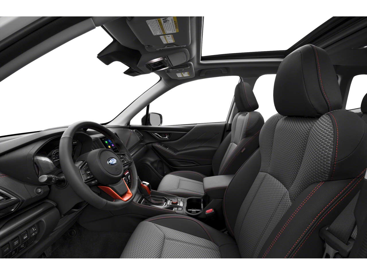 Inside, the Forester Sport offers a spacious and comfortable cabin with unique styling touches. The interior features sport cloth seating with distinctive orange contrast stitching, heated front seats, a leather wrapped steering wheel, and a touchscreen STARLINK multimedia system with Apple CarPlay and Android Auto integration. With seating for five and a versatile cargo area, the Forester provides excellent visibility and flexibility for passengers, groceries, or outdoor gear.