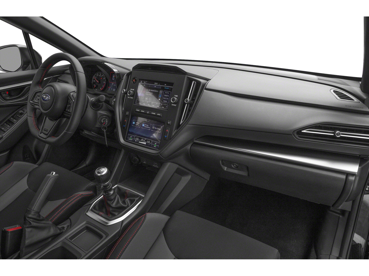 Inside, the WRX Base features a driver-focused cabin with sport cloth seating and a clean, modern layout. A large 11.6-inch touchscreen infotainment system comes standard with wireless Apple CarPlay and Android Auto, offering seamless connectivity and intuitive control. The interior is designed for both comfort and performance, with supportive sport seats, a leather-wrapped steering wheel, and a practical layout that still provides seating for five and usable trunk space.